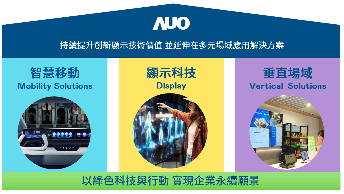 我們持續推動「雙軸轉型」,在精進顯示技術附加價值(Go Premium),與深化垂直市場應用(Go Vertical)的策略下,對應918博天娱乐的優勢競爭力與趨勢,我們奠定顯示技術、智慧移動、垂直場域三大永續營運支柱,在顯示技術領域的根基之上,延伸布局多元場域應用解決方案。將先進顯示科技助力智慧移動及垂直場域發展,並以綠色科技與行動為實踐,在轉型之路上貫徹永續經營之願景。